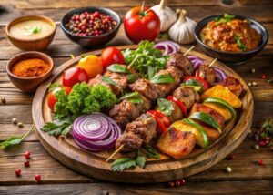 Gekruide kalfs en lamsgehakt bereid in tomatensaus en linzen geserveerd met salade, witte rijst en brood.